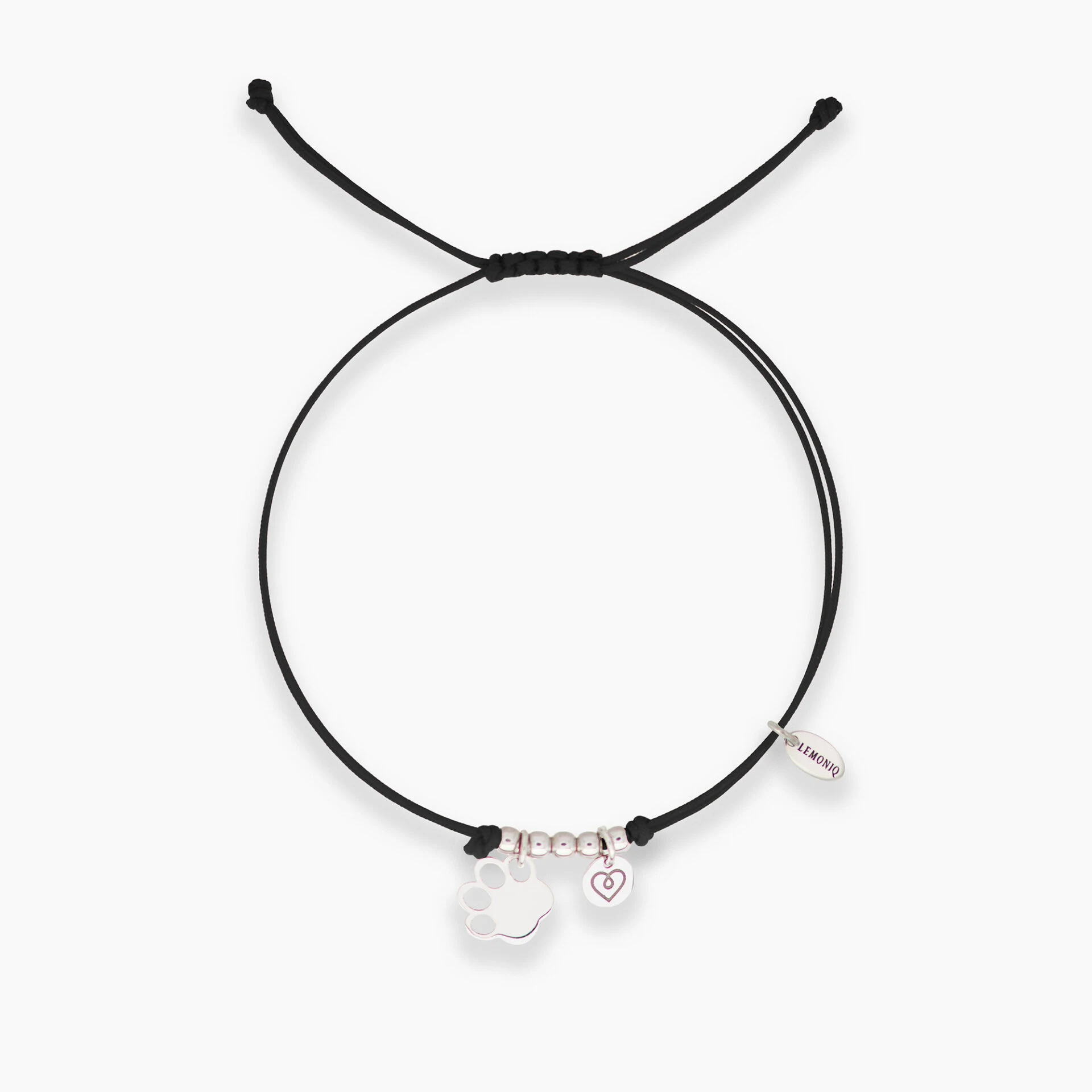 Elegancka bransoletka na czarnym sznurku z ozdobnym, regulowanym wiązaniem typu makrama. Zdobiona czterema srebrnymi kuleczkami oraz dwiema zawieszkami: psią łapką idealną na grawer oraz kółeczkiem z wygrawerowanym serduszkiem. Ta minimalistyczna bransoletka z łapką psa sprawdzi się jako codzienny, symboliczny dodatek dla miłośników zwierząt. Całość zapakowana jest na ozdobnym kartoniku z napisem „Najlepszy Przyjaciel” i w eleganckiej kopercie – gotowej do wręczenia na prezent.
