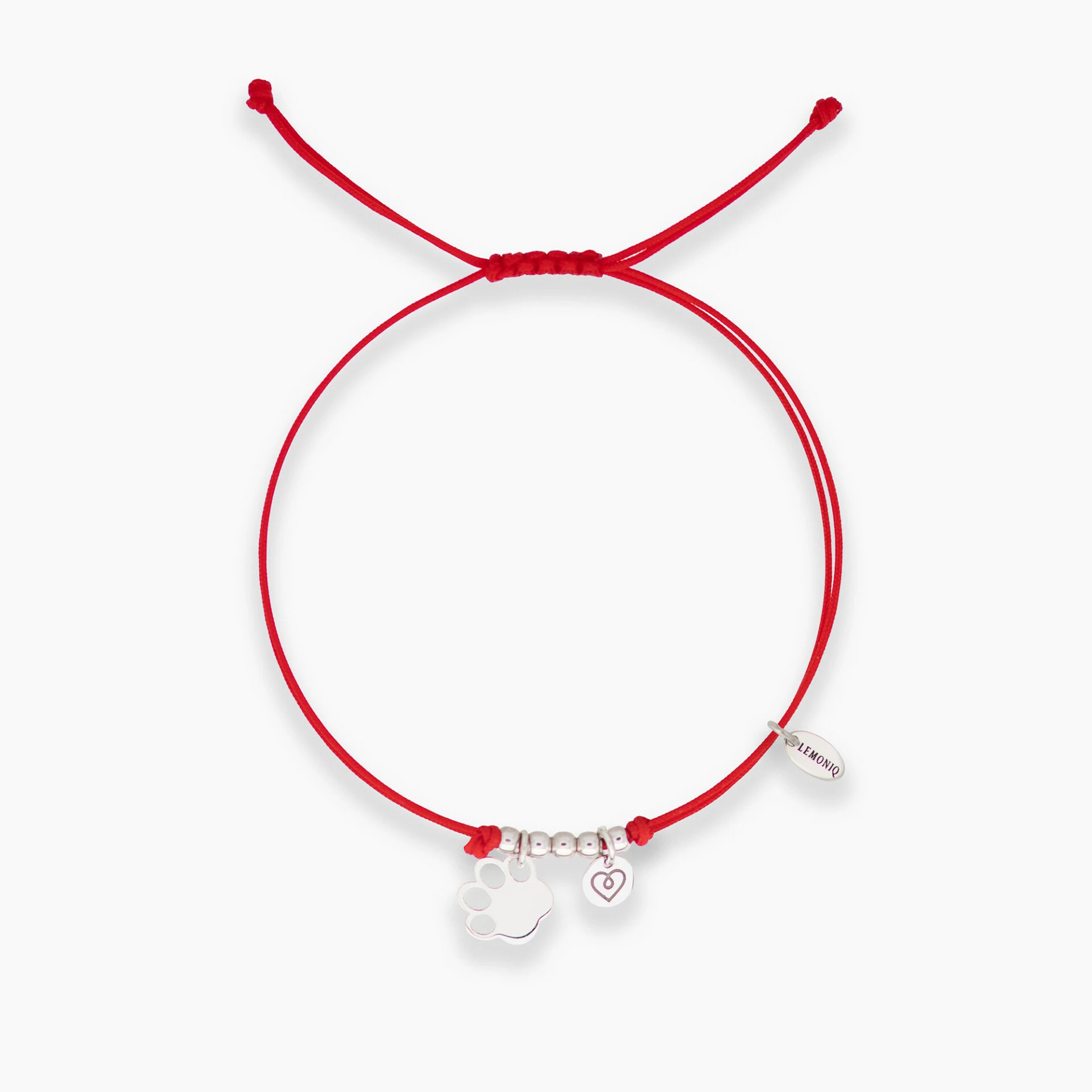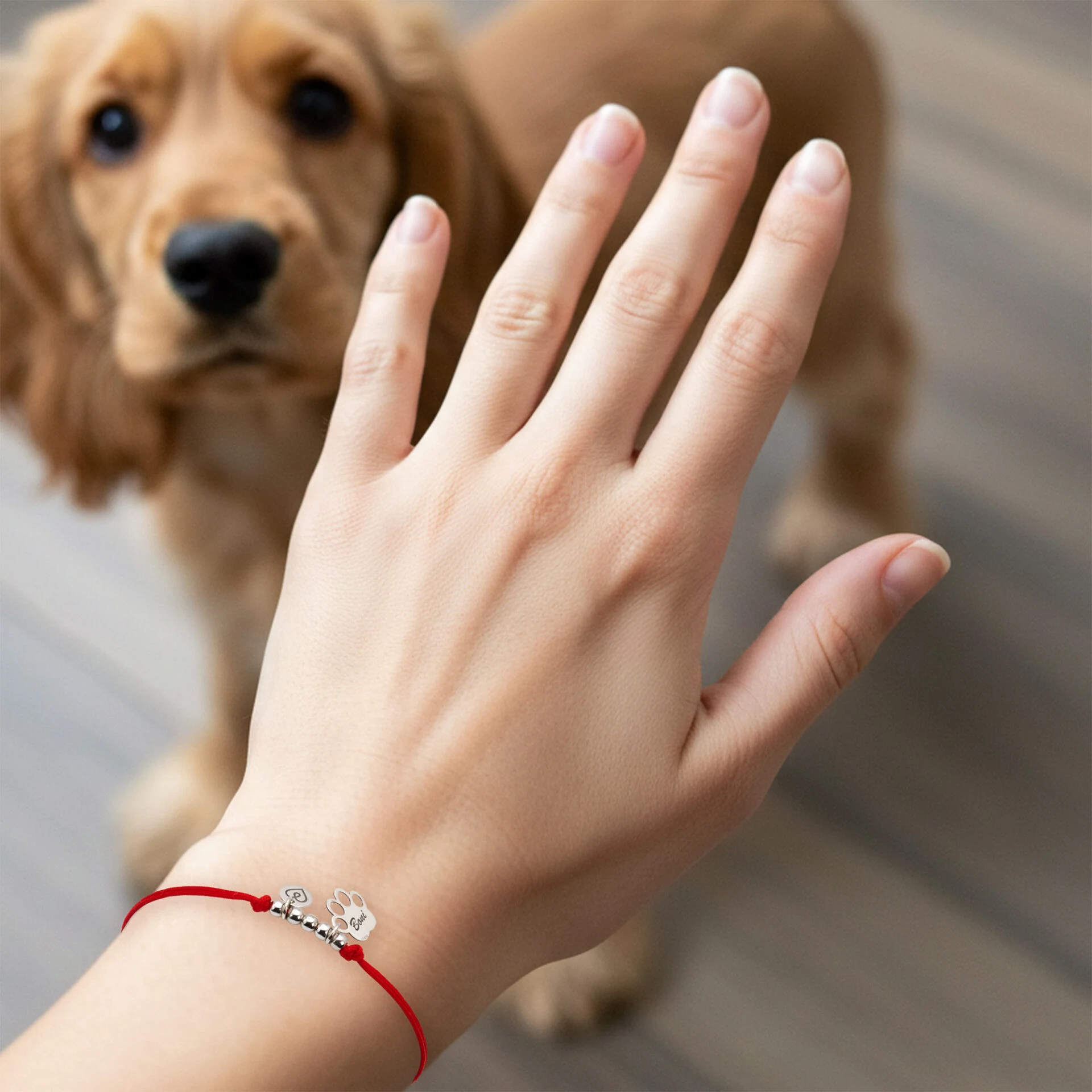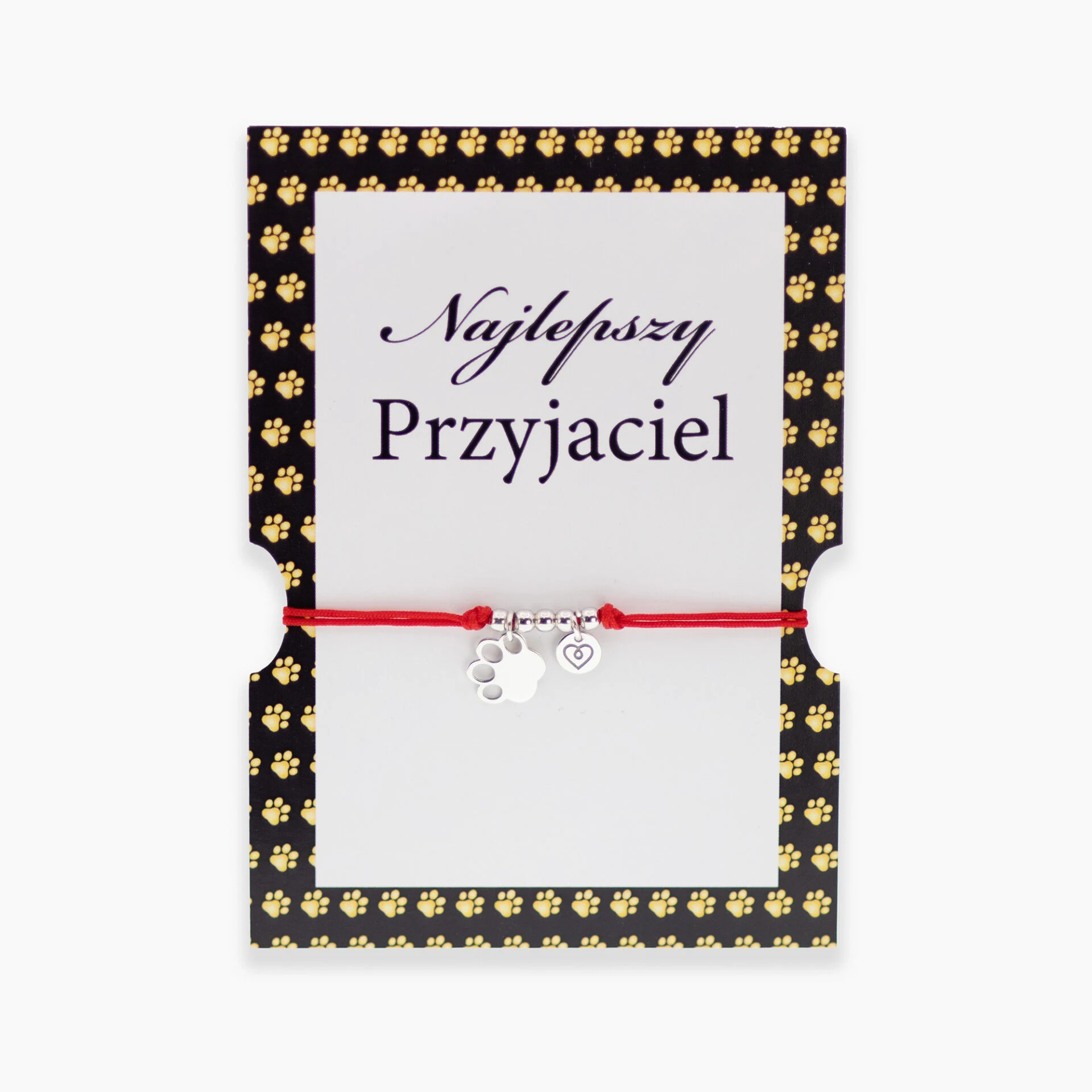 Wyjątkowa bransoletka na czerwonym sznurku z ozdobnym, regulowanym wiązaniem typu makrama. Zdobiona czterema srebrnymi kuleczkami oraz dwiema zawieszkami: psią łapką z możliwością wykonania graweru oraz kółeczkiem z grawerowanym serduszkiem. Ta bransoletka z łapką psa to idealny prezent dla miłośników psów – połączenie srebra i intensywnej czerwieni przyciąga uwagę i ma symboliczny charakter. Produkt znajduje się na ozdobnym kartoniku z napisem „Najlepszy Przyjaciel” i zapakowany jest w elegancką kopertę, dzięki czemu jest gotowy do wręczenia.