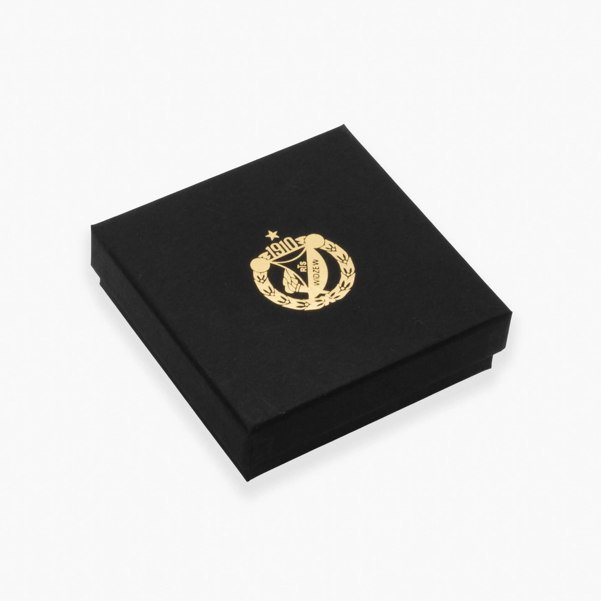Produkt zapakowany jest w eleganckie czarne, jubilerskie pudełko ze złotym herbem Klubu na wieczku. Gwarancją autentyczności jest klubowy hologram umieszczony na spodzie pudełka.