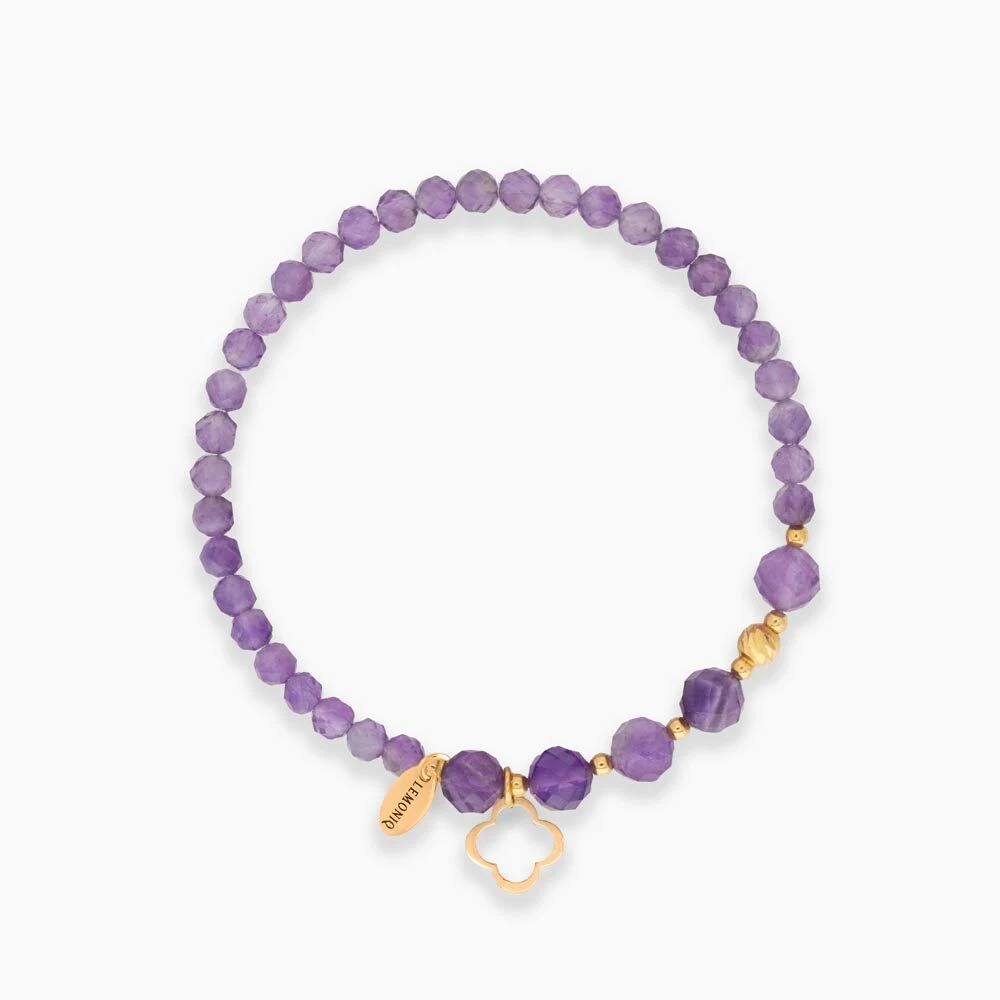 Niesymetryczna bransoletka na elastycznej gumce, wykonana z dużych, głęboko fioletowych kamieni ametystu. Centralny akcent oraz subtelne, pozłacane elementy ze srebra próby 925 podkreślają elegancję, a zawieszka w formie konturu koniczyny dodaje biżuterii symbolicznego charakteru. Ametyst znany jest jako kamień ochrony, spokoju i harmonii, a motyw koniczyny przynosi szczęście i pozytywną energię. Bransoletka dzięki elastycznej bazie wygodnie dopasowuje się do nadgarstka, zapewniając komfort w codziennym noszeniu, łącząc elegancję z funkcjonalnością.