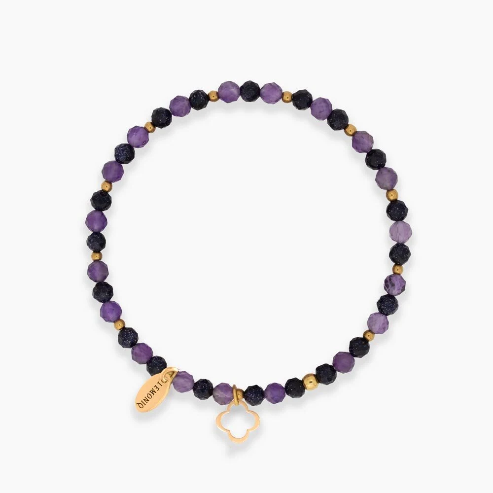 Symetryczna bransoletka na elastycznej gumce, wykonana z dużych kamieni ametystu o głębokiej, fioletowej barwie oraz Nocy Kairu o granatowym odcieniu z migoczącymi refleksami. Całość dopełniają subtelne, pozłacane elementy ze srebra próby 925 oraz zawieszka w kształcie konturu koniczyny – symbol szczęścia i pomyślności. Uznaje się, że ametyst sprzyja równowadze i ochronie, noc Kairu wspiera spokój i harmonię, a koniczyna przynosi pozytywną energię. Elegancka i pełna symboliki, bransoletka wygodnie dopasowuje się do nadgarstka, zapewniając komfort noszenia każdego dnia.