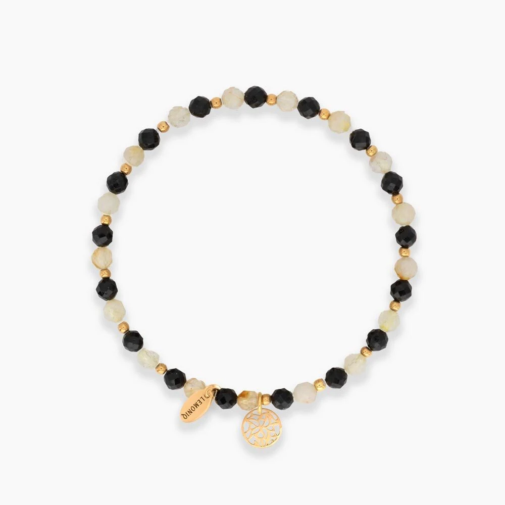 Symetryczna bransoletka na elastycznej gumce, wykonana z dużych kamieni cytrynu o słonecznej, złocistej barwie oraz turmalinu w głębokiej czerni. Subtelne, pozłacane akcenty ze srebra próby 925 oraz zawieszka w formie ażurowego kółeczka dodają jej elegancji i lekkości. Cytryn uznawany jest za kamień radości i dobrobytu, a czarny turmalin za minerał ochronny i stabilizujący. W połączeniu z motywem koła – symbolem pełni i harmonii – tworzą biżuterię o wyjątkowym znaczeniu i nowoczesnym charakterze. Bransoletka dzięki elastycznej bazie wygodnie dopasowuje się do nadgarstka, zapewniając komfort w codziennym noszeniu.
