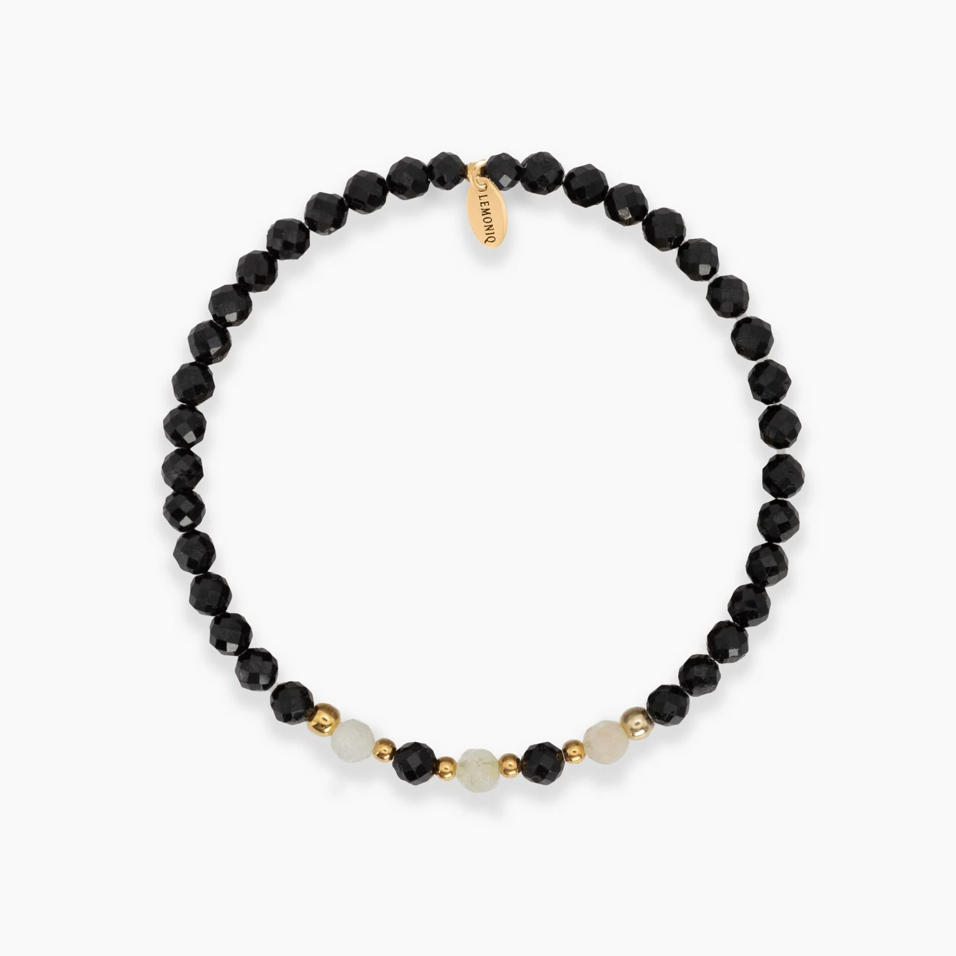 Bransoletka wykonana z drobnych kamieni czarnego turmalinu, których głęboki, szlachetny połysk nadaje jej eleganckiego i ponadczasowego charakteru. Między nimi pojawiają się delikatne pojedyncze akcenty cytrynu, wnosząc subtelne świetliste przełamanie i odrobinę słonecznej energii do kompozycji.