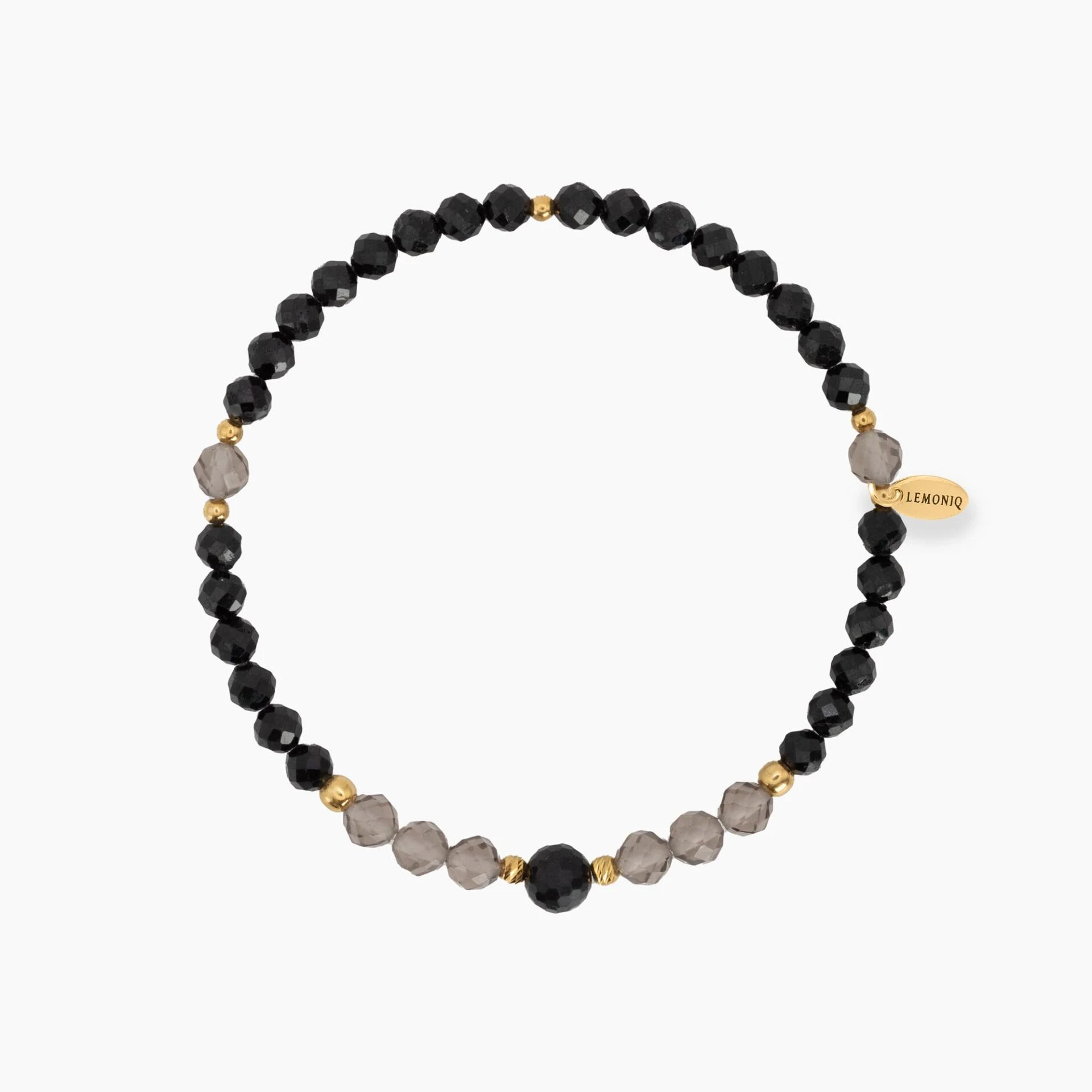 Bransoletka wykonana z drobnych kamieni czarnego turmalinu, których głęboki połysk i wyrazista struktura nadają jej ponadczasowej elegancji. Kompozycję przełamują subtelne akcenty kwarcu dymnego, wprowadzając delikatną przestrzeń i szlachetną harmonię w kolorystyce.