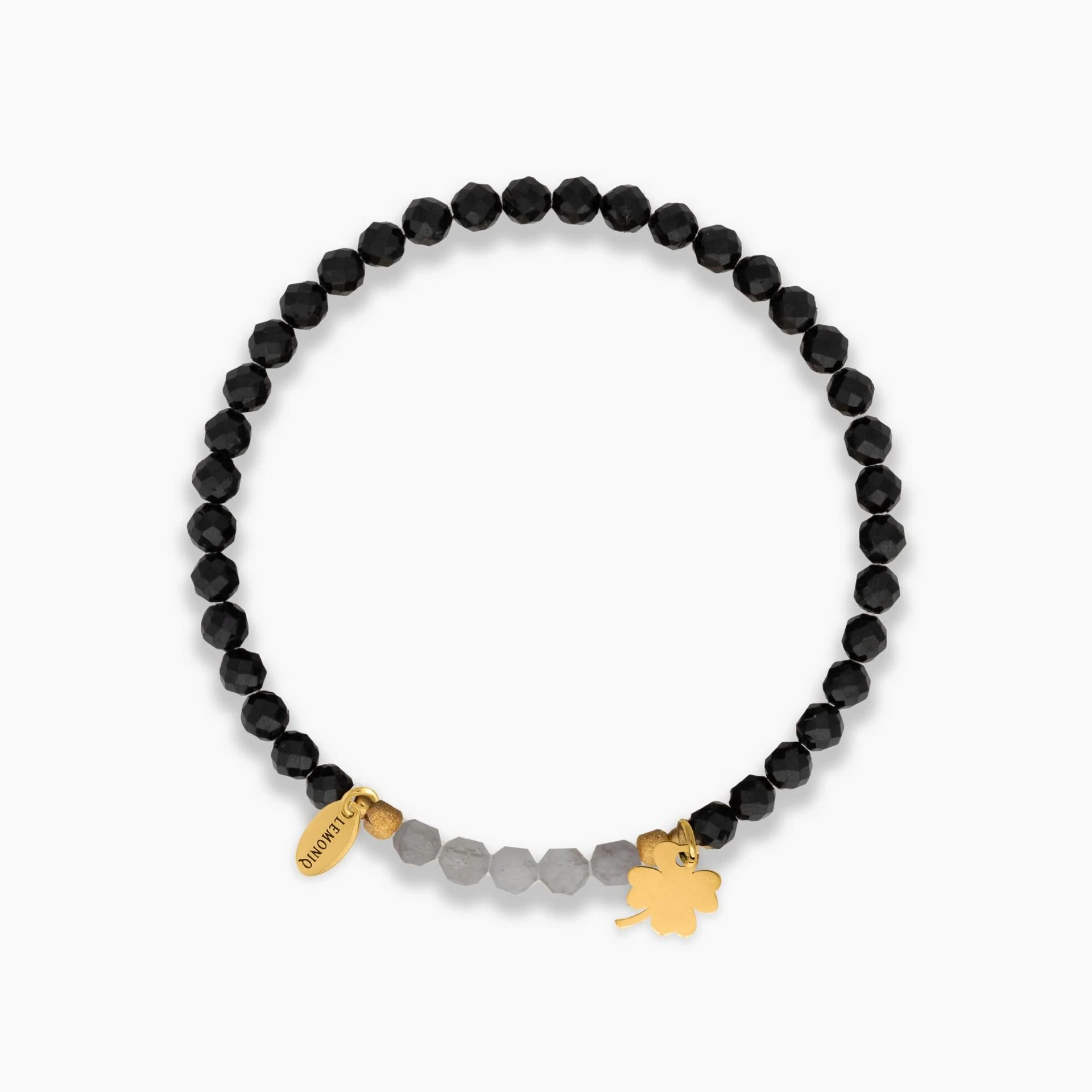 Bransoletka wykonana z naturalnego czarnego turmalinu, którego głęboka czerń nadaje biżuterii elegancki i ponadczasowy charakter. Centralnym akcentem kompozycji są kamienie kwarcu dymnego, wprowadzające transparentny kontrast o ciepłej tonacji. Całość dopełnia zawieszka w kształcie koniczyny wykonana z pozłacanego srebra próby 925, symbolizująca szczęście i pozytywną energię.