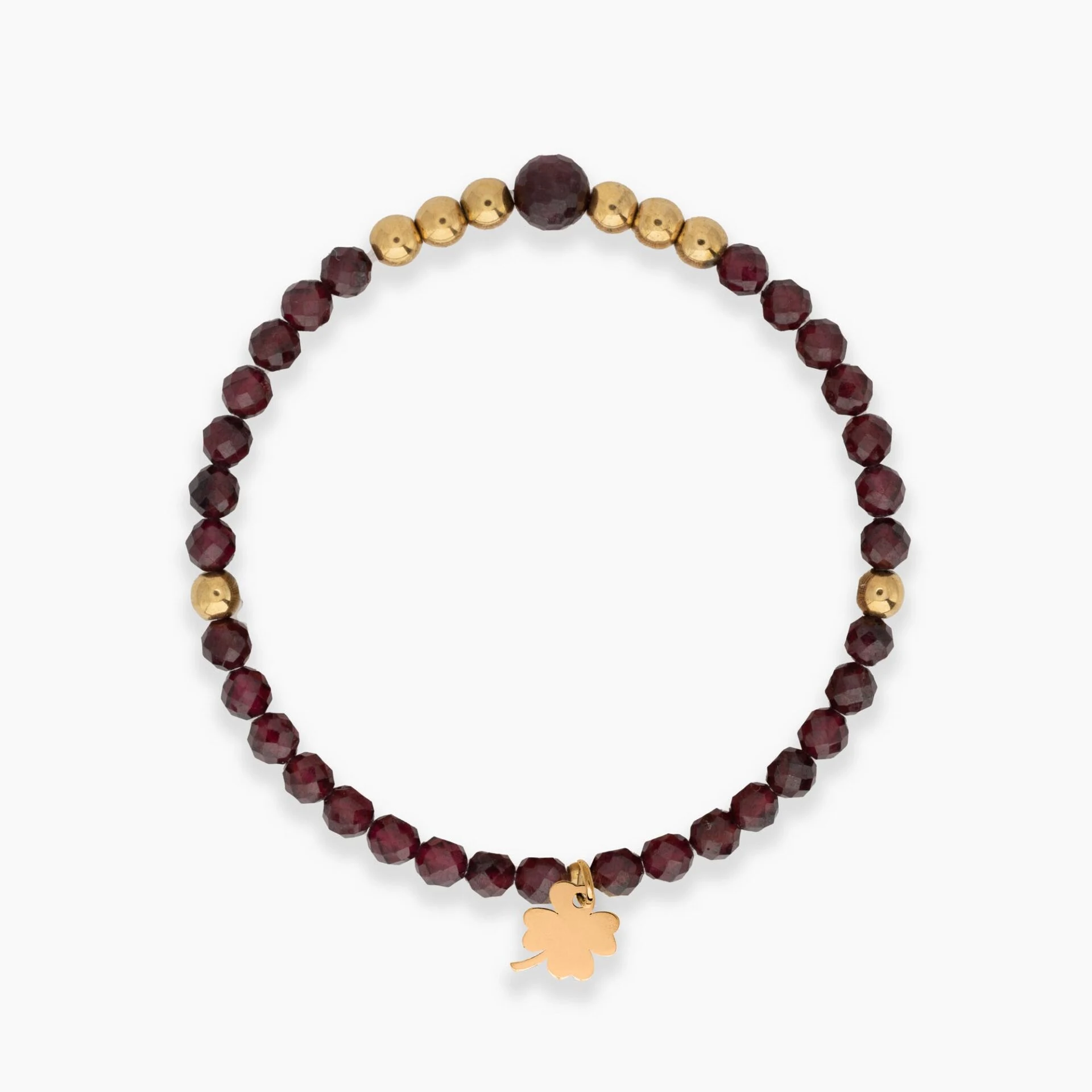 Bransoletka wykonana z drobnych kamieni granatu, których głęboki, winno-rubinowy odcień emanuje zmysłową elegancją i subtelnym blaskiem. Granat jest tu połączony z hematytem, dodającym kompozycji wyrafinowanego charakteru i harmonijnej stabilności. Centralny akcent tworzy starannie wyeksponowana sekwencja kamieni, dopełniona pozłacanymi elementami ze srebra próby 925 oraz zawieszką w kształcie koniczyny – symbolem szczęścia i sprzyjającej energii.