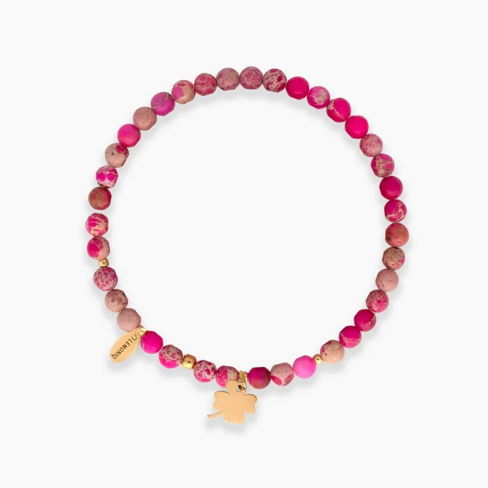 Bransoletka na elastycznej gumce, wykonana z naturalnego jaspisu o subtelnych, różowych odcieniach. Jej charakter podkreślają delikatne, pozłacane akcenty ze srebra próby 925 oraz zawieszka w kształcie konturu koniczyny – symbol szczęścia i pomyślności. Jaspis znany jest jako kamień harmonii i wewnętrznej siły, a w połączeniu z koniczyną tworzy biżuterię o eleganckim, symbolicznym przesłaniu. Bransoletka dzięki elastycznej bazie wygodnie dopasowuje się do nadgarstka, zapewniając komfort w codziennym noszeniu.