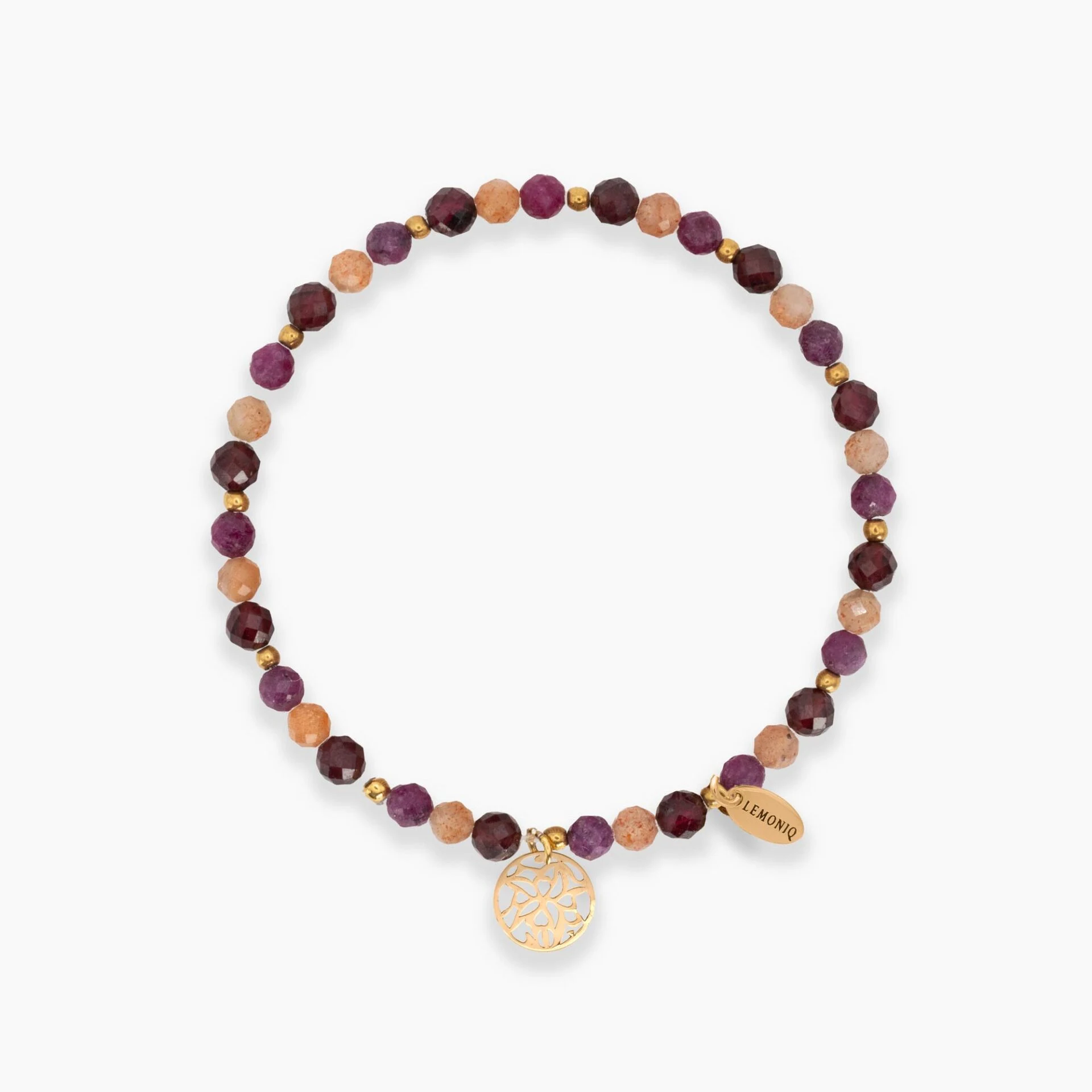 Elegancka bransoletka stworzona z harmonijnie i symetrycznie zestawionych kamieni: ciepłego kamienia słonecznego, głębokiego granatu oraz szlachetnego rubinu. Starannie dobrana kompozycja odcieni tworzy subtelny, a przy tym wyrafinowany efekt — idealny dla miłośniczek delikatnej biżuterii z wyrazem.