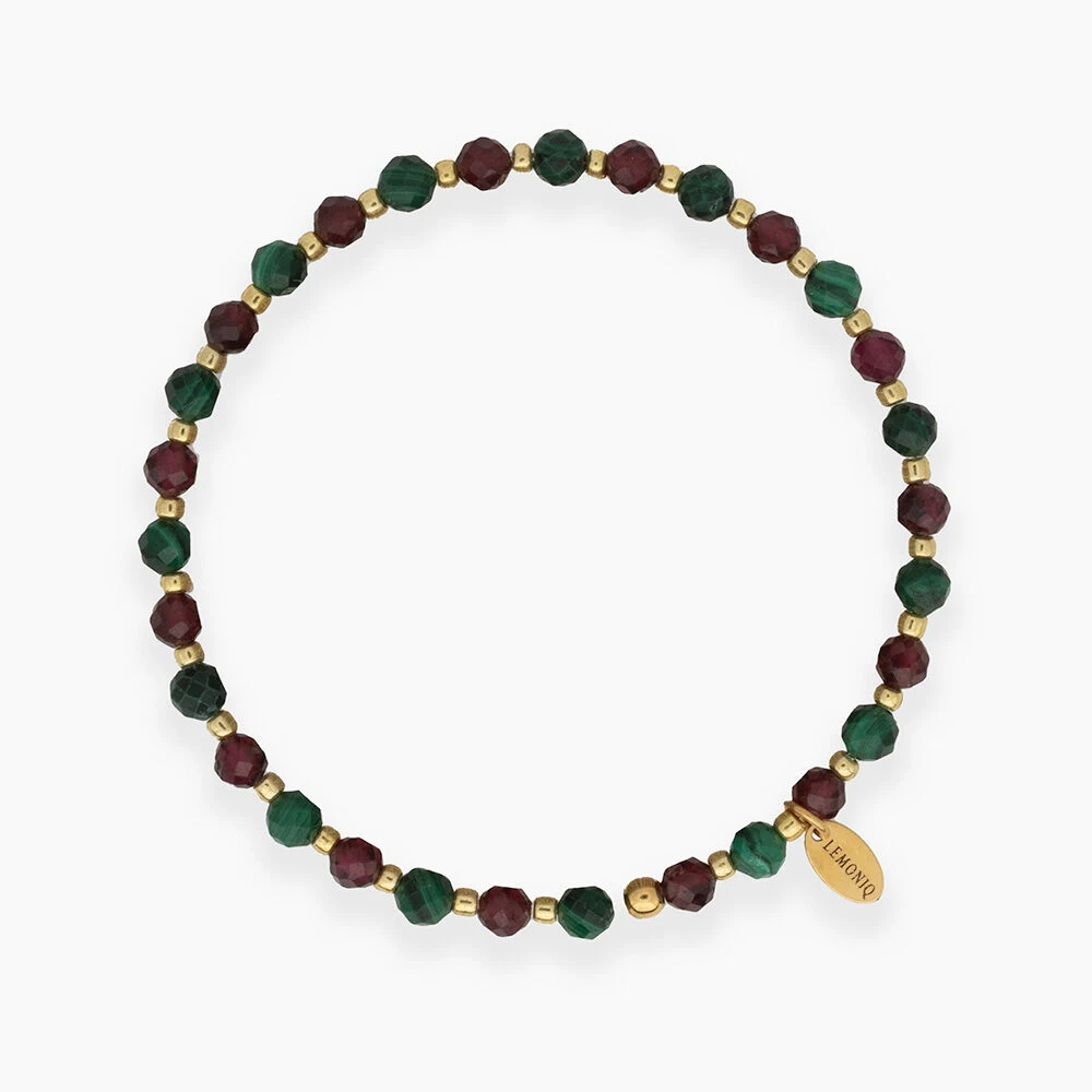 Bransoletka skomponowana z dużych kamieni malachitu o intensywnej zieleni i głębokich, bordowych granatów, zestawionych w harmonijnym, symetrycznym układzie. Ich kontrast barw podkreślają subtelne akcenty ze srebra próby 925 pokrytego złotem, które dodają całości świetlistego blasku i elegancji. Kompozycja przyciąga uwagę wyrafinowanym połączeniem barw – energetycznej zieleni i zmysłowej czerwieni – tworząc luksusowy i wyjątkowy efekt. Bransoletka została osadzona na elastycznej bazie, która dopasowuje się do nadgarstka i zapewnia wygodę noszenia. Bransoletkę pakujemy w eleganckie pudełko jubilerskie – gotowe na prezent.