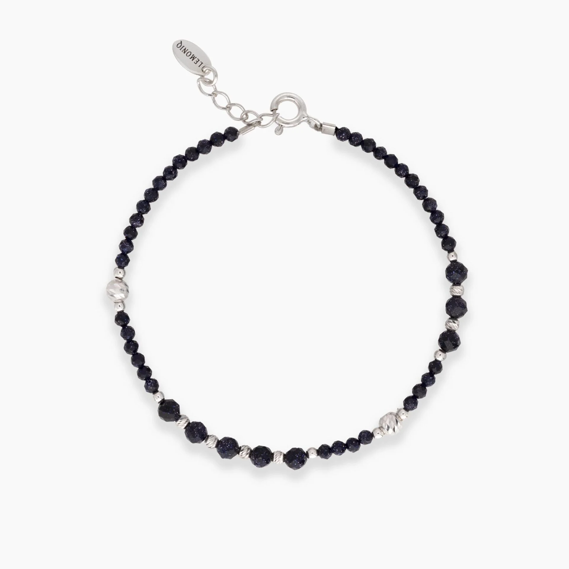 Bransoletka wykonana z drobnych, fasetowanych kamieni nocy Kairu o głębokim granatowo-czarnym odcieniu z subtelnym, gwiezdnym połyskiem. Jej ozdobną część tworzą większe kamienie nocy Kairu, rozmieszczone symetrycznie i przedzielone delikatnymi kuleczkami ze srebra próby 925. Połączenie migoczących refleksów kamieni z chłodnym blaskiem srebra nadaje całości luksusowego, eleganckiego charakteru.