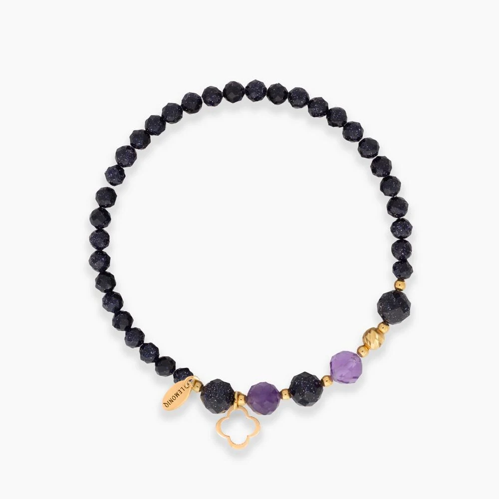Asymetryczna bransoletka z naturalnego kamienia Nocy Kairu o głębokiej, ciemnej barwie, przełamana subtelnymi akcentami ametystu w intensywnym fiolecie. Kompozycję uzupełnia delikatna, pozłacana zawieszka w kształcie konturu koniczyny, symbolizująca szczęście i pozytywną energię. Elementy ze srebra próby 925, pokryte złoceniem, dodają całości luksusowego połysku i elegancji. Kamień Nocy Kairu wspiera spokój i równowagę, ametyst sprzyja intuicji i ochronie, a koniczyna przyciąga szczęście. Bransoletka osadzona jest na wygodnej elastycznej bazie, dopasowując się do nadgarstka i sprawdzając się w codziennym użytkowaniu.