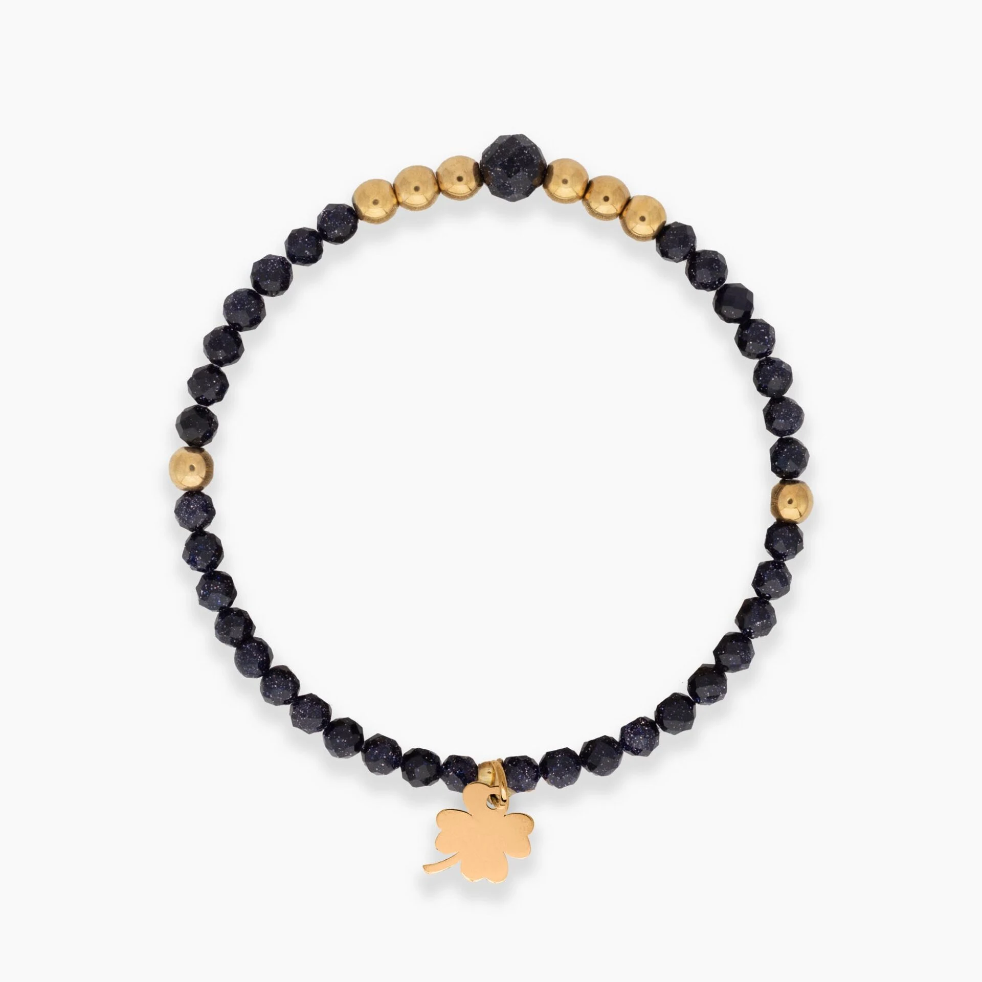 Bransoletka wykonana z drobnych kamieni nocy Kairu, które dzięki delikatnemu połyskowi drobinek przypominają rozgwieżdżone niebo, nadając biżuterii wyjątkowego, subtelnie magicznego blasku. Towarzyszy im hematyt, tworząc eleganckie i harmonijne wykończenie kompozycji. Centralny akcent stanowi ozdobna sekwencja wyróżnionych kamieni, uzupełniona pozłacanymi elementami oraz delikatną zawieszką w kształcie koniczyny – symbolem szczęścia i sprzyjających okoliczności.
