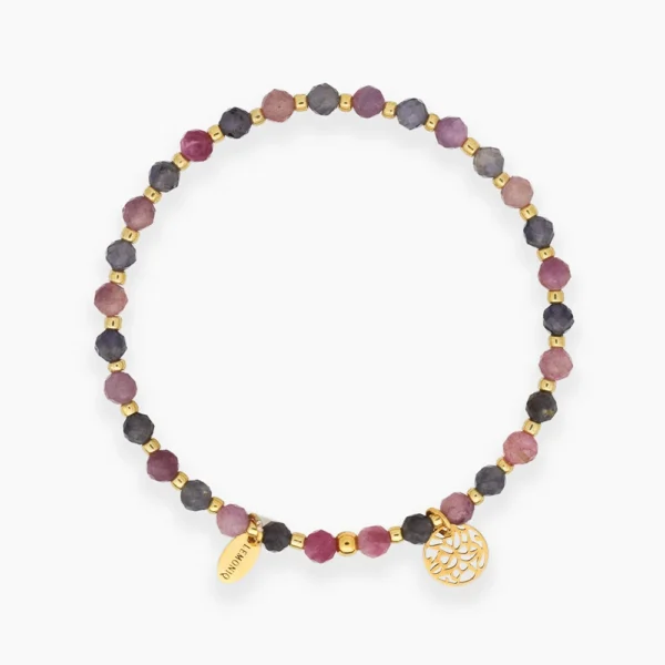 Elegancka bransoletka z naturalnych kamieni: różowego turmalinu, ametystu i granatu, wykonana na elastycznej gumce, która dopasowuje się do nadgarstka i zapewnia wygodę noszenia. Każdy kamień został subtelnie oddzielony delikatną przekładką, a zestawienie barw różu, fioletu i głębokiej czerwieni nadaje całości niezwykle szlachetny i elegancki charakter. Różowy turmalin jest uważany za kamień miłości i harmonii, ametyst wspiera wewnętrzną równowagę i spokój, a granat symbolizuje energię i determinację. Bransoletka pięknie prezentuje się zarówno solo, jak i w połączeniu z innymi modelami.