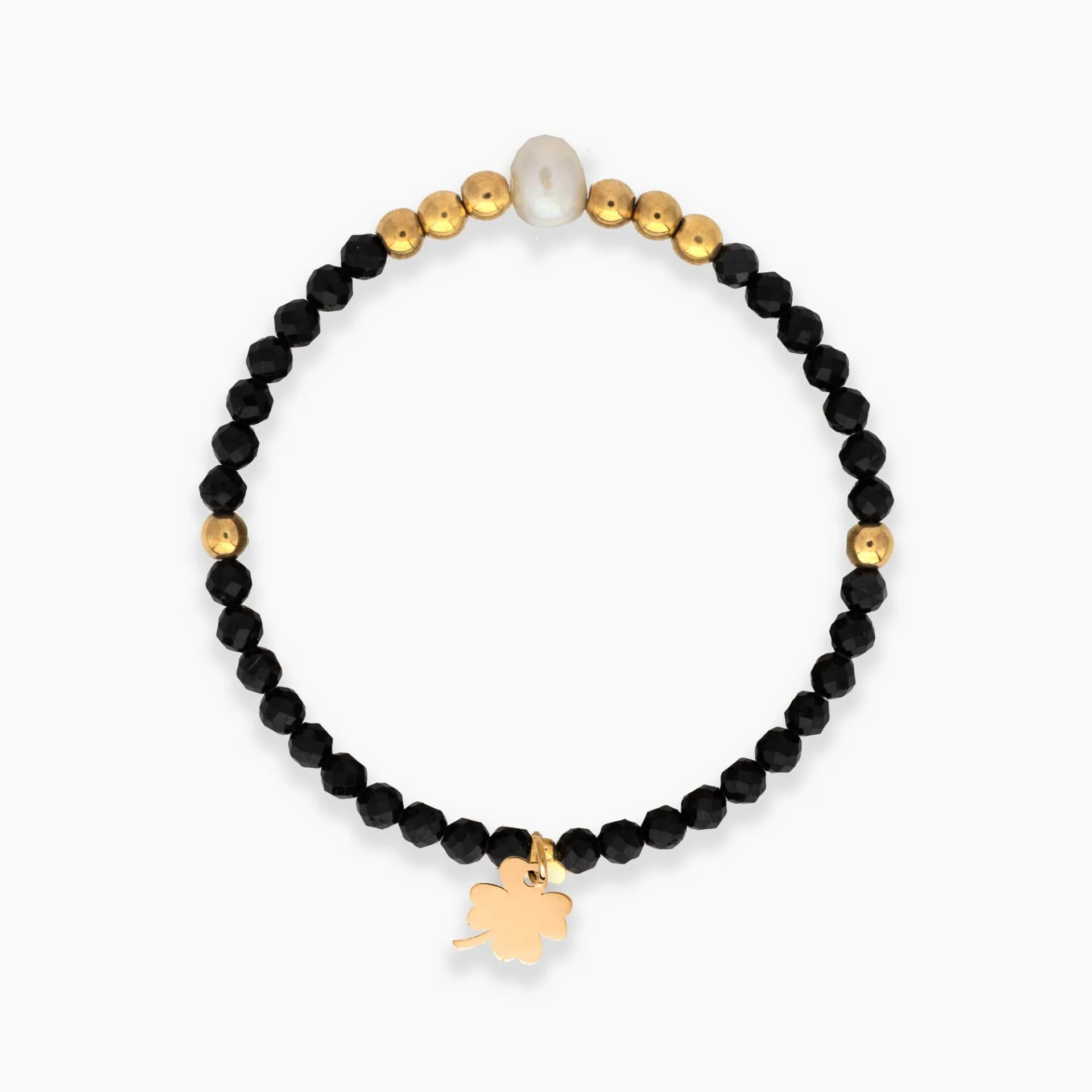 Uważa się, że czarny turmalin jest kamieniem ochronnym, wspierającym poczucie stabilności i wewnętrznego ugruntowania, natomiast hematyt sprzyja pewności siebie i koncentracji. Perła kojarzona jest z delikatnością i spokojem, a koniczyna symbolizuje szczęście. Bransoletka na elastycznej gumce zapewnia wygodę oraz idealne dopasowanie do nadgarstka każdego dnia.