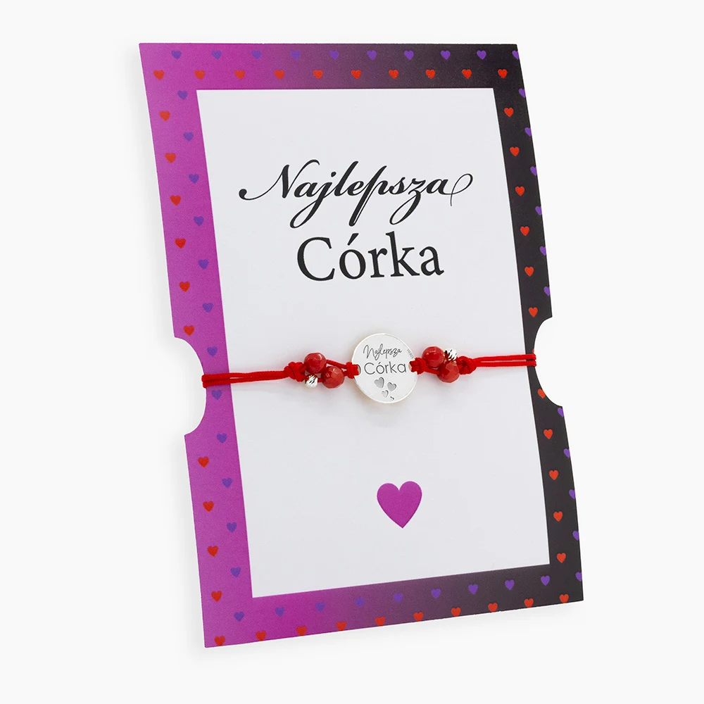 Bransoletka dla Córki na czerwonym sznurku. Głównym elementem ozdobnym bransoletki jest wykonane ze srebra 925 kółeczko, na którym wygrawerowano napis „Najlepsza Córka” i wycięto malutkie serduszka. Po obu stronach srebrnego elementu zaplecione są kamienie naturalne – czerwone korale. Sznurek posiada wiązanie typu makrama co daje możliwość łatwej regulacji rozmiaru. Bransoletka nałożona jest na ozdobny kartonik i zapakowana w elegancką kopertę. Prezent jest gotowy do wręczenia.