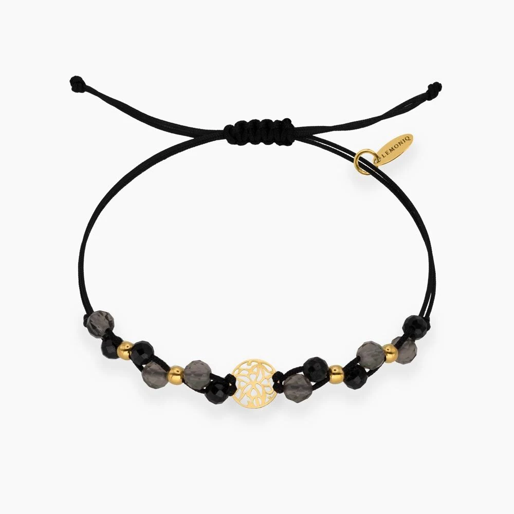 Bransoletka na sznurku w eleganckim, czarnym kolorze, ozdobiona naturalnymi kamieniami kwarcu dymnego i turmalinu. Całość uzupełniają subtelne, pozłacane kuleczki ze srebra 925, które nadają kompozycji wyrafinowanego charakteru. Centralnym elementem ozdobnym jest delikatne ażurowe kółeczko, wycięte w srebrze 925 i pokryte złotem. Regulowane wiązanie typu makrama sprawia, że bransoletka idealnie dopasowuje się do nadgarstka i jest wygodna w codziennym noszeniu.