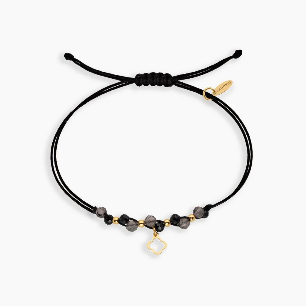 Stylowa bransoletka na regulowanym sznurku makrama w odcieniach czerni i szarości, z centralnym elementem w postaci pozłacanej zawieszki konturu koniczyny. Ozdobiona została naturalnymi kamieniami turmalinu, których subtelne barwy podkreślają elegancki charakter kompozycji. Całość dopełniają drobne akcenty ze srebra 925 pozłacanego, dodające delikatnego blasku. Regulowane wiązanie typu makrama zapewnia komfort noszenia i idealne dopasowanie do nadgarstka.