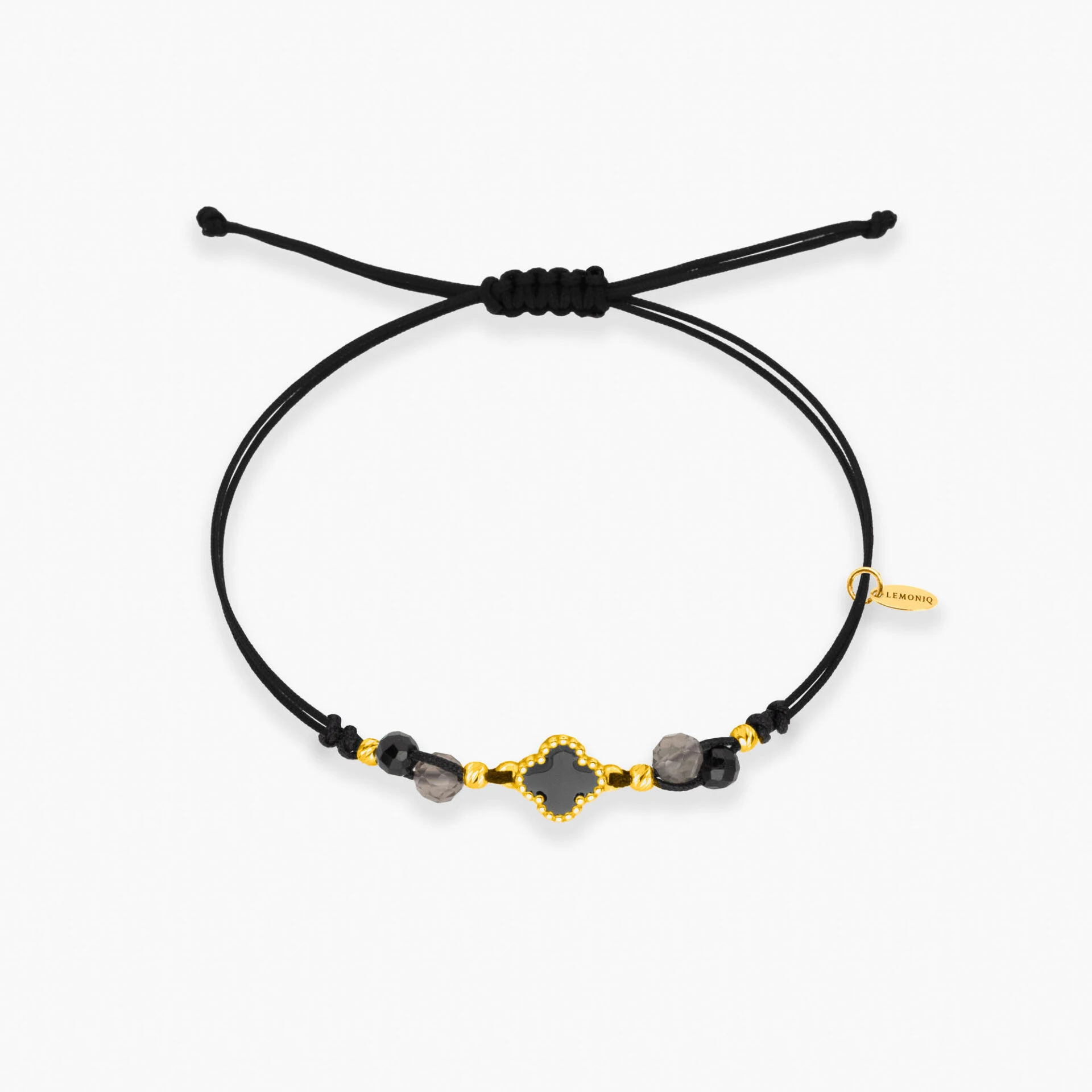 Bransoletka na sznurku – turmalin i kwarc dymny, koniczyna, srebro 925 pozłacane, czarna